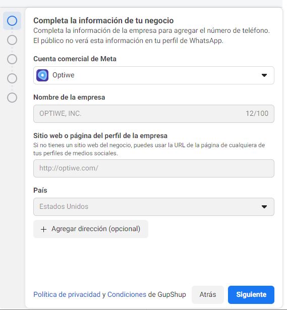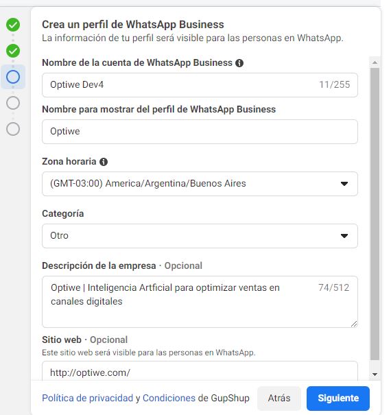 Una vez definido el número que desean habilitar, desde Optiwe les brindaremos un link para completar los siguientes pasos: