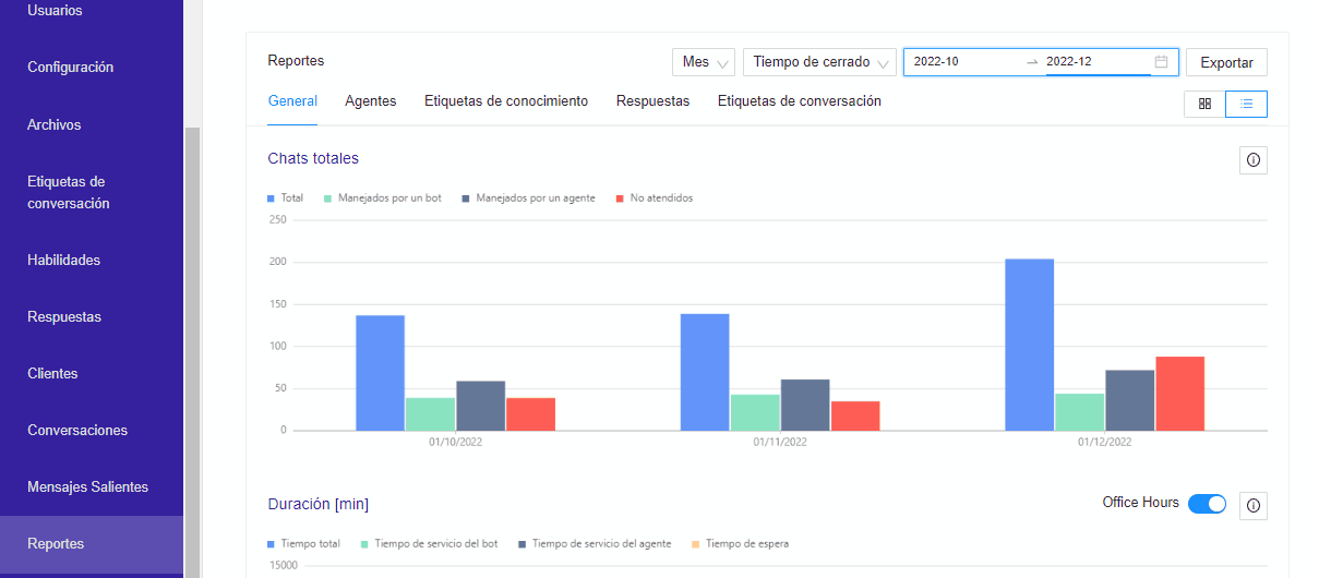 En primer lugar debes seleccionar si deseas el reporte por tiempo de creación de las conversaciones o tiempo de cerrardo, luego elegir el rango y configurar el calendario: