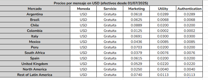 Los precios oficiales se encuentran debajo y pueden consultarse en: <https://developers.facebook.com/docs/whatsapp/pricing/>
